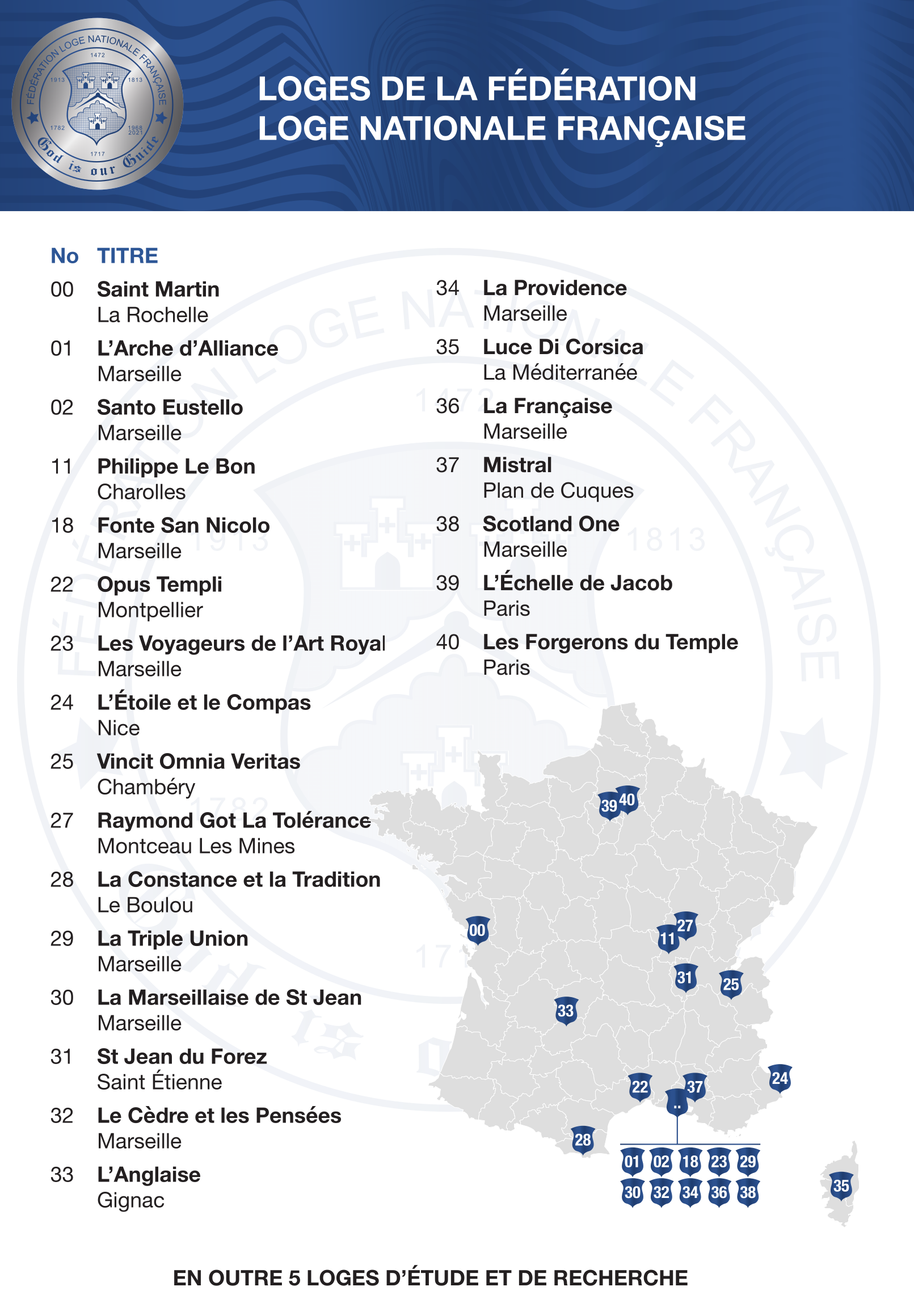 La Fédération LNF® compte aujourd’hui 40 loges dont 5 loges d’étude et de recherche, spécificité de cette Franc-maçonnerie Traditionnelle, soit une configuration semblable à celle d’origine.